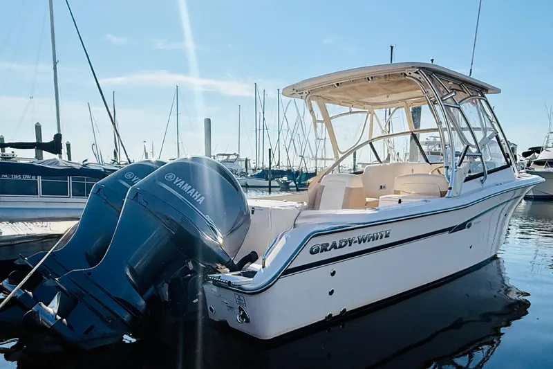 This 2014 Grady-White 275 Freedom is powered by upgraded twin Yamaha 200HP four-stroke outboards and is loaded with desirable factory options, including the hardtop with full curtain enclosure.