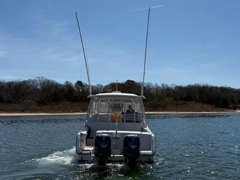 FEATURES: White Hull, Hardtop w/Painted Aluminum Frame; Hydraulic Trimtabs w/Indicator & Retractor, Swim Platform w/Ladder, Ski Pylon, 32-gallon aft insulated livewell w/light, Dockside Power w/Galvanized Isolator, Battery Charger System, (2) Automatic Bilge Pumps, Stbdside Tuna Door, Fold-down Fwd Facing Transom Bench, Outrigger Plates w/15'Outriggers, Portside Cockpit Seating Lounge w/Removeable Table, Cockpit Toe Rails, Self-Bailing Cockpit, (4) 12V Accessory Outlets, Cockpit Bolsters, Blue LED Cockpit Lights, Cockpit Sink and Cutting Board, Aft Facing Cockpit Refrigerator Door, Cabin Lounge Seating, Head w/Sink, Mirror and Freshwater Shower (recessed), Storage Net, RWB Colored LED Spreader Lights, (8) LED Recessed Lights, (2) Hatches, (4) Rod Holders, Rod Storage Racks, Forward Bolsters, Windlass Anchor w/Remote Switches at Helm & Windlass