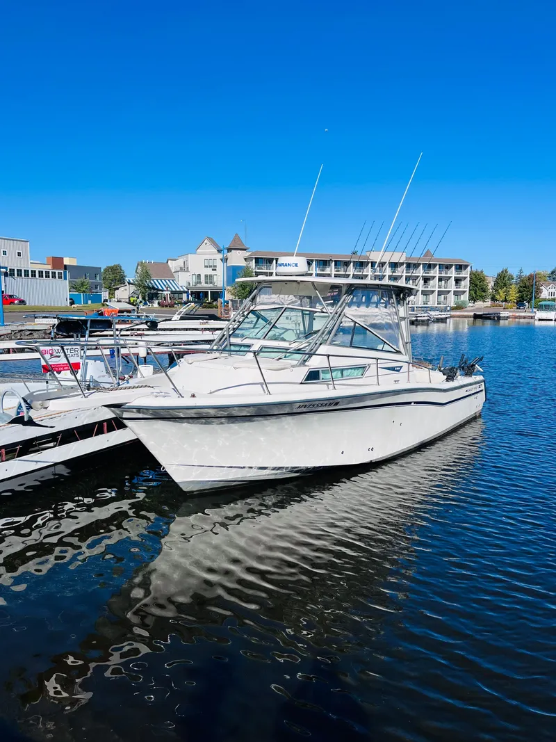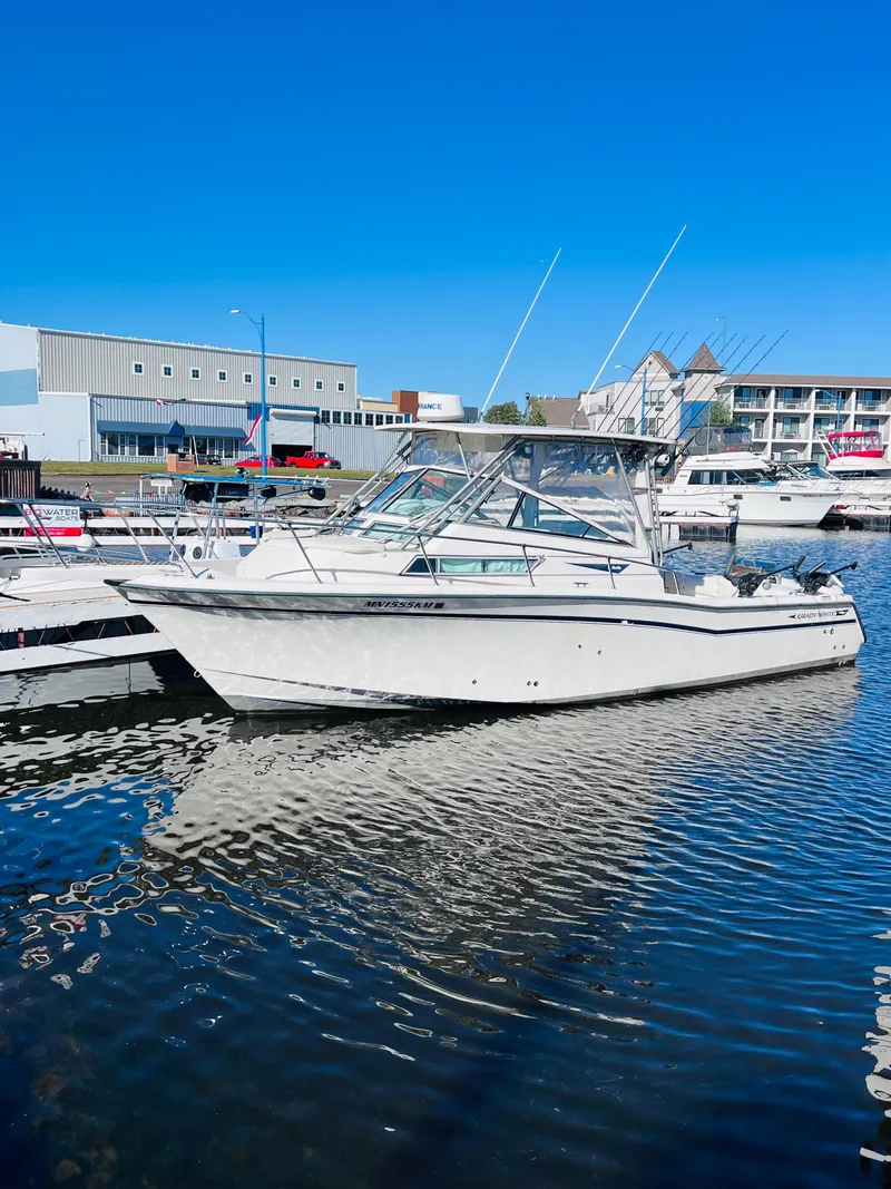 The Grady-White 280 Marlin has the largest walkaround in the Grady-White fleet with a spacious cabin and a well-arranged cockpit layout. Hull construction is solid fiberglass, and the Marlin's deep-V hull was specifically designed by Hunt & Associates. The below deck cavities are filled with polyurethane flotation, which makes the Marlin unsinkable which is an uncommon feature in a boat this size. With her walkaround deck layout and big cockpit, the interior dimensions are necessarily limited but hardly confining. Indeed, there are comfortable berths for four (including a big quarter berth that extends below the bridgedeck), plus a stand-up head compartment with shower, excellent headroom, and a compact galley. There is an engine bracket platform with transom door and swim ladder, fish box, 30-gallon livewell, and tackle center.