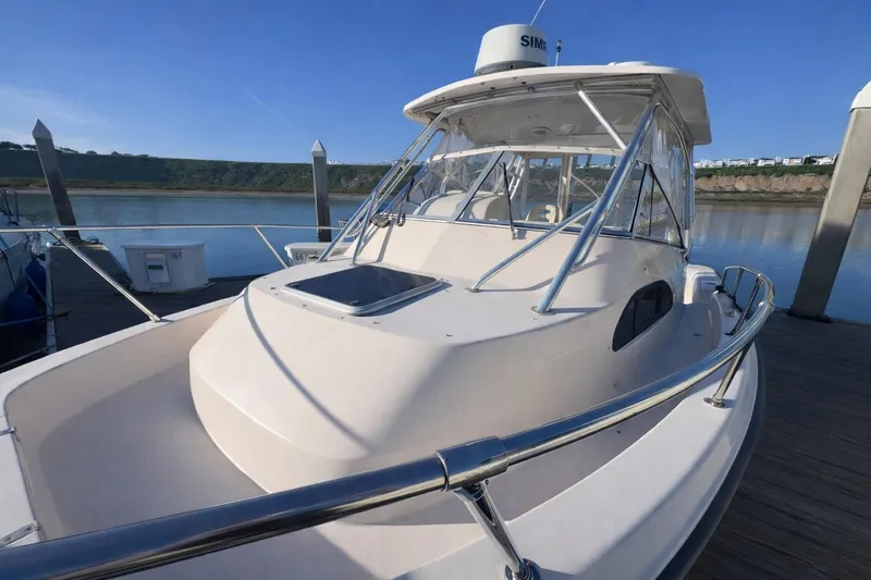 The cabin offers overnight accommodations for extended fishing trips or weekend cruising, while the spacious cockpit layout is built for serious anglers: huge fish boxes, livewell, wide walkarounds, and plenty of storage. Helm visibility is excellent, and the electronics package makes navigating coastal waters effortless. A bow thruster adds extra maneuverability-ideal for tight docking situations and the Newport Harbor environment.