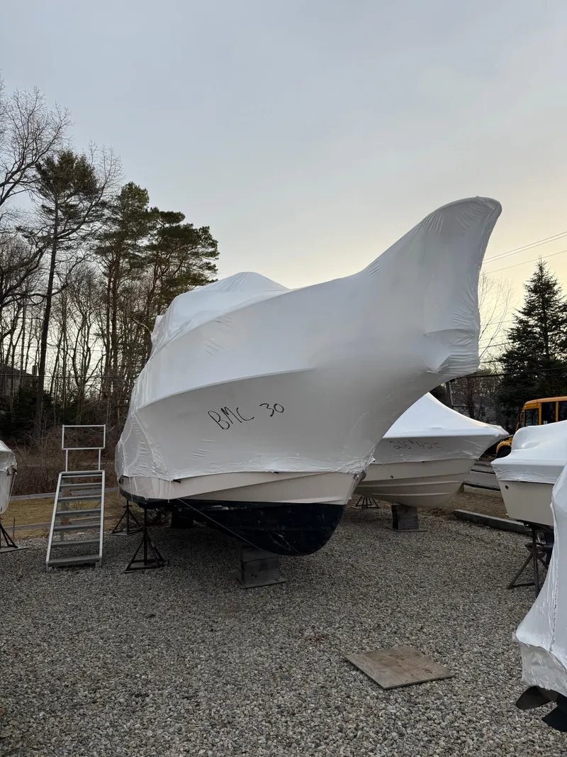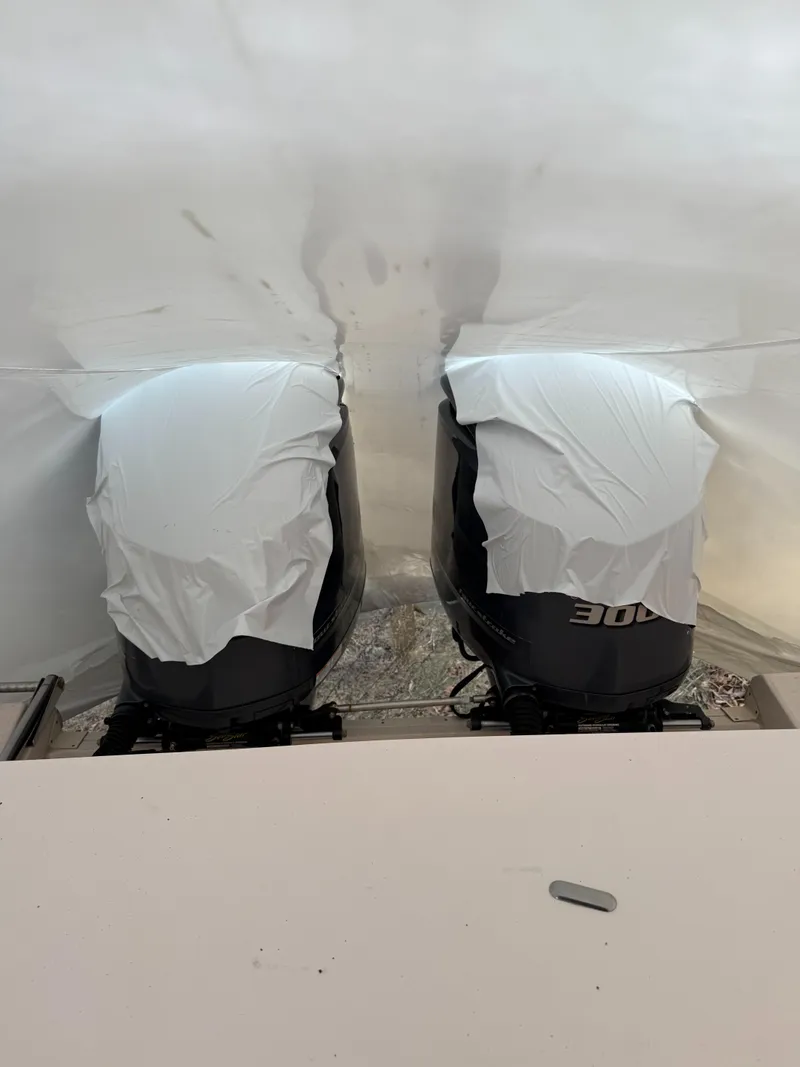 - Hardtop w/radio box, storage nets, spreader lights, rod holders (4), outrigger plates & drop, front & side curtains (navy or ivory)