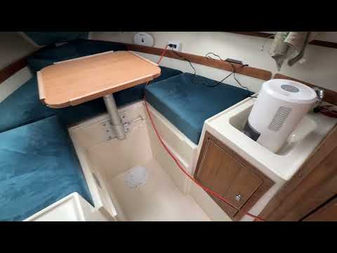 Down below is where this boat really stands out for its size. You get a roomy V-berth, an extra mid-berth, an enclosed head (rare for a 25'), plus a small galley setup. It's more than just a fishing boat you can actually spend the night comfortably.