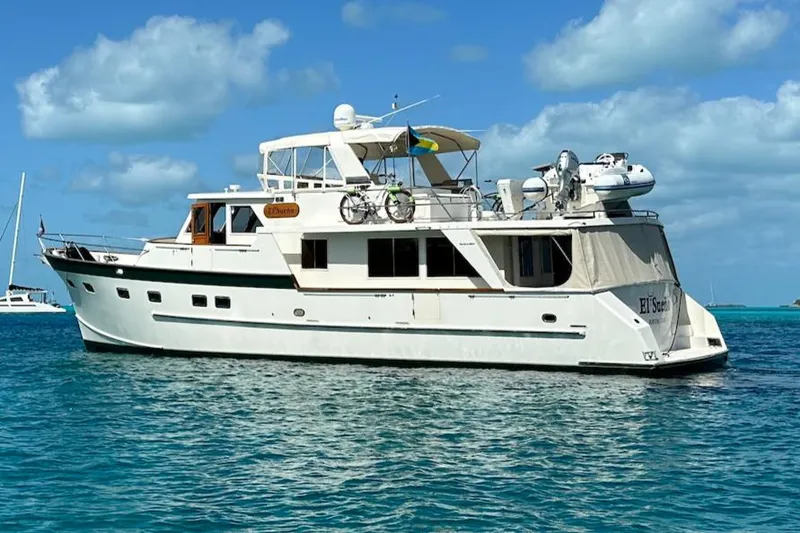 "EL SUENO" is a beautiful three stateroom raised pilothouse cruiser. She is designed and equipped (bow and stern thrusters) so that a couple can operate the boat without the need for crew.