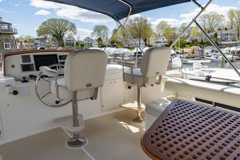 The Flybridge is comfortable and spacious with full instrumentation, two helmseats, settees, table and davit with tender located aft.