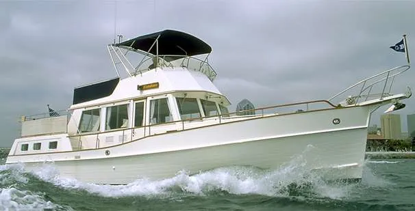 The Grand Banks 42 Motoryacht has been decades in the making. The original Ken Smith design has been amended and updated with the practical input of her owners. The experience gained since the laying of the first GB 42 keel in 1966 is reflected in each one commissioned today. Her practical layout, sturdy fiberglass construction, deep water design, and long range capability all add up to a complete cruising boat. The Grand Banks semidisplacement hull design, with a fine entry forward, hard chines aft, and a full keel has been proven on waters around the world. Single or twin diesel power will deliver economy at hull speed and provide higher cruising speeds when larger than the standard engines are chosen. Many power options are available. The exterior of the hull and deckhouse on the GB 42 is smooth gelcoated fiberglass. Teak decking is laid over the fiberglass on the main deck and flybridge. The bulwarks surrounding the wide main deck are capped with a sturdy teak safety rail providing safe movement from bow to stern for those on board. The Grand Banks 42: In production since the 60s, her hull was redesigned in the early 90s giving the proven Grand Banks semi-displacement hull a longer waterline and an increased beam. Ideal for a couple with children or guests, she cruises economically at 9 knots, yet 17 knots is typical with optional engines. The Classic offers two staterooms, separated by the main saloon and galley. A variety of layouts are available including an aft cabin with an island double bed. The Europa's main saloon opens to a protected cockpit for expanded, one-level living. Two forward staterooms are standard. The Motoryacht provides increased living space with a spacious, full-width stateroom aft, and two additional staterooms forwardThe aft sundeck expands the outdoor living area and provides room for stowage.