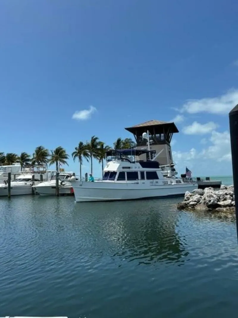 From the teak swimplatform, you step through the transom gate onto the aftdeck and walk forward on either same-level side deck. Walk forward on the port side deck and you can step up onto the trunk cabin and then up to the flybridge or walk forward to the salon access door. Once inside the salon, you will find the galley port forward, guest stateroom with ensuite head forward, lower helm and side deck access door starboard forward, glass storage and icemaker cabinet to starboard, L-shaped seating with storage, folding teak table and 2 stools starboard aft, benchseat with storage and entertainment/storage cabinetry port aft and the full-beam master stateroom with queen size centerline berth and a separate head and shower aft. Engine room access is via salon sole hatches. The entire interior headliner was replaced in 2021.