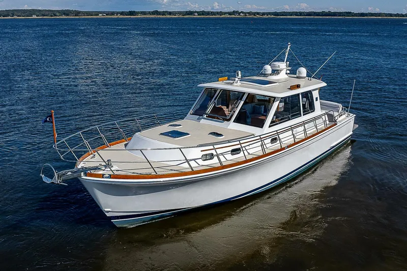 - Layout: salon with U-settee to port, straight settee to starboard; helm seat and companion seat; galley down to port, two staterooms: forward VIP suite with en-suite head & shower, guest stateroom, day head/shower to starboard; utility room below