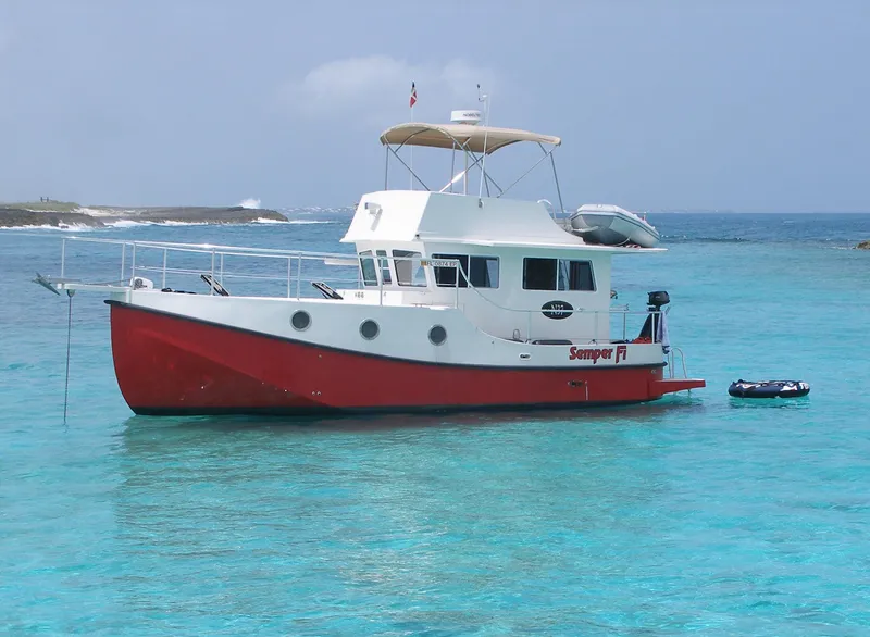 Truly "America's Go-Anywhere Liveaboard" trawler, the N40 features a 16' beam, which it carries down to the waterline. This results in living spaces comparable to the typical 45 or 48-foot trawler. Her huge galley comes equipped with home-sized appliances - including a 23 c.f. refrigerator/freezer. Her walk-in engine room has 6' standing headroom at the built-in workbench and easy standing access all the way around her twin Yanmar diesels.
