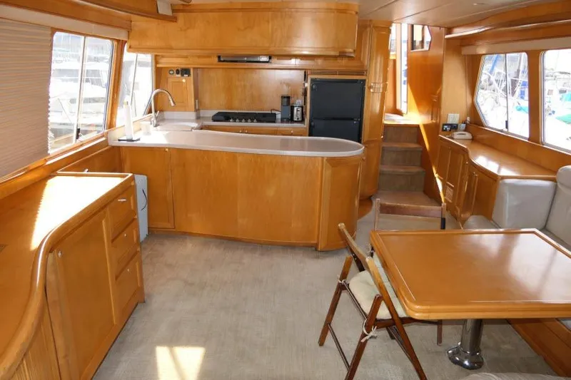 Experience luxury and craftsmanship aboard this 1999 Hampton Pilothouse 490. This yacht features exquisite Birdseye maple inlay and Maplewood interior, accentuated with rich maple trim, offering a blend of elegance and modern functionality perfect for discerning yachtsmen.