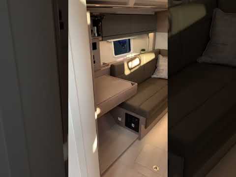 The lower deck layout includes three cabins on board including a master suite in the bow. There is a wardrobe at the backboard and placed on the starboard side. Guest cabins also feature an incredible amount of space and storage, particularly for a sub-40 foot sailing yacht. Included is a custom Iverson's dodger.