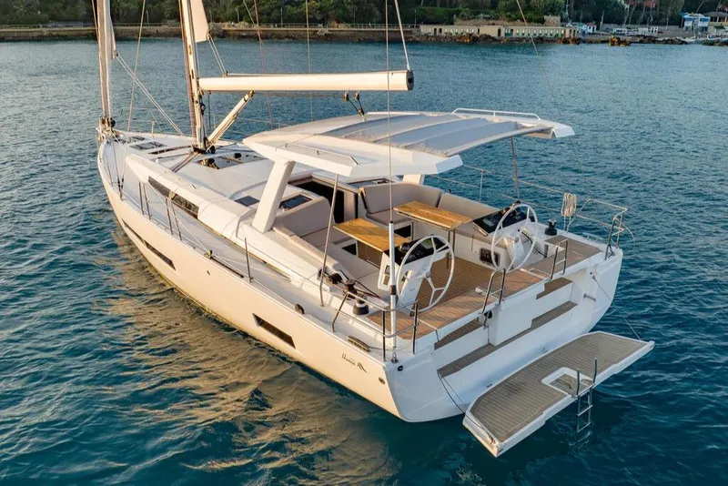 GRP deck with anti-slip surface, isophthalic gelcoat, color: Signal White (RAL 9003), 1st layer vinyl ester resin with balsa sandwich core. 2 cockpit lockers, 1 space for life raft, stern locker on port, stowage for running rigging at helm position, anchor locker at bow. Twin wheel Jefa steering system with emergency tiller 2 stainless steel steering wheels with leather cover standard GRP wheels also available Cockpit table, stainless steel with teak tops, on stb Cockpit table, stainless steel with teak tops, on ps Pulpit and pushpit, 316 stainless steel Railing, incl. stanchions and stainless steel wire Covered halyards and control lines lead to cockpit helm position, organizers and jammers, 4 mooring cleats, handrails on coach roof 2 LEWMAR 45 ST EVO electric halyard winches Bathing platform, manual fold-out with swimming ladder Composite bowsprit with integrated anchor and forestay fitting Self tacking jib system Mainsheet system 8 large and 6 small deck hatches - openable, anchor locker hatch 4 large coach roof side windows - openable, 4 portlights in coach roof