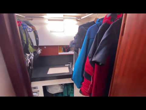 This Hanse 470e has the optional Cherry Interior with light laminate floors. Forward is a large owners cabin (A1 Hanse version). The are 2 fixed hull ports and opening hatches. There is a large storage locker under the berth, and there are additional storage lockers forward of the berth, and a large wardrobe and desk on the starboard side. Additional cabinets to port and starboard sides. On the port side is the owners head compartment, with sink, shower and a head. An opening hatch provides light and ventilation.