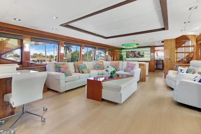 Boarding the 96' 2005 Hargrave Capri Skylounge "OSSUM DREAM" is from the Swim Platform or the Aft Deck side boarding gates. The spacious Aft Deck has both fixed and loose seating options. Open steps lead to the Boat Deck. A sliding door leads to the Salon with a three person walk behind bar to port, with a six cushion sofa forward. To starboard is a 55” TV and six storage cabinets and two swivel chairs, forward.