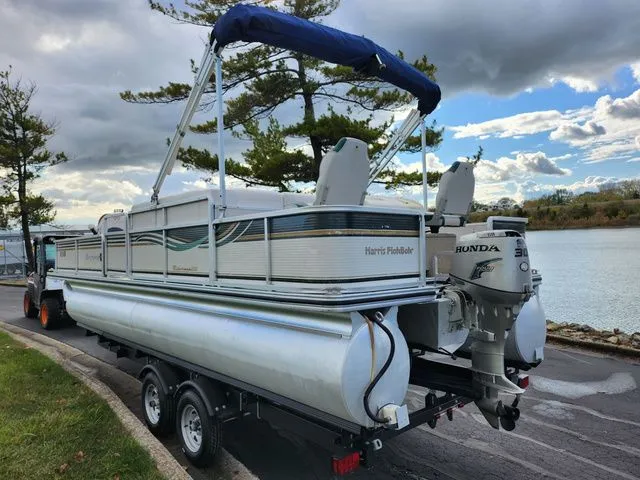 2002 Harris 220 Fisherman, 2002 Harris 220 Fisherman Pontoon comes with: 50 h.p. Honda Power, Bimini Top, 2 Front & 1 Rear Fish Chairs, Center Console, Cocktail Table, and more. This unit DOES NOT Come with a trailer.