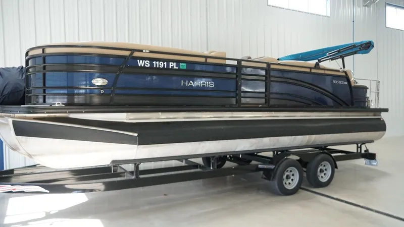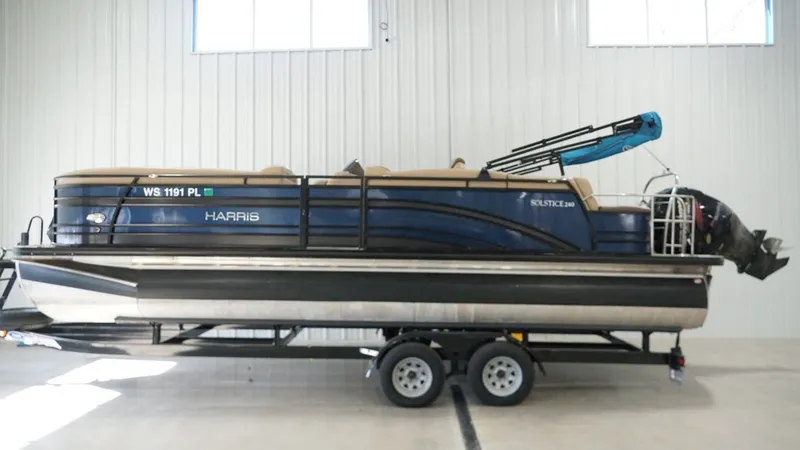 , The 2018 Harris 240SOL SL TT delivers the perfect mix of luxury, comfort, and on-water performance. Powered by a Mercury 200 Pro Verado, this tri-toon is smooth, responsive, and ready for everything from casual cruising to watersports. The raised helm, Desert Camel interior, and upgraded audio system create a premium experience for both driver and guests. Loaded with comfort features and thoughtful details, this Harris stands out with its stylish Midnight Blue and Black Sapphire finish, LED lighting, and durable woven teak flooring. Paired with a 2023 Mid America tandem axle trailer, it's ready for summer fun.