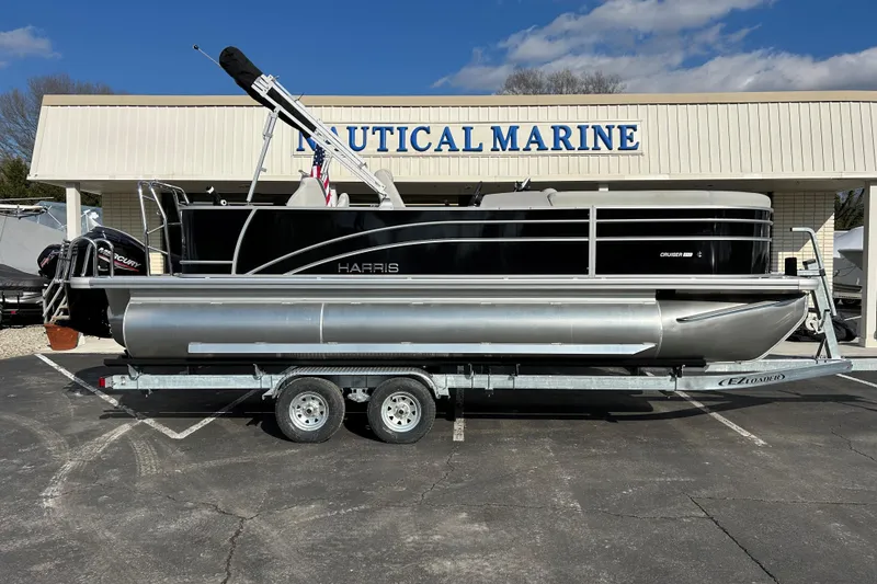 This Harris Cruiser 210 is sitting on a tandem-axle trailer with brakes, offering peace of mind for transport and storage. A refined tri-toon that delivers luxury, versatility, and timeless Harris craftsmanship.