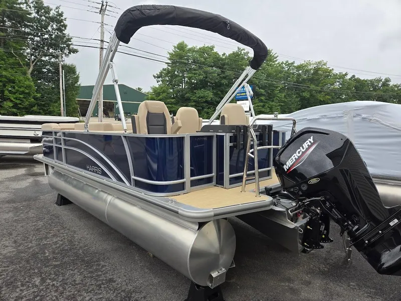 2025 Harris Cruiser FC with a Mercury 90hp, Midnight Blue Metallic, Fish Cruiser floorplan, dune furniture, ski tow bar, high back helm seat, fish seat, desert beige seagrass flooring, wireless charger and much more!
