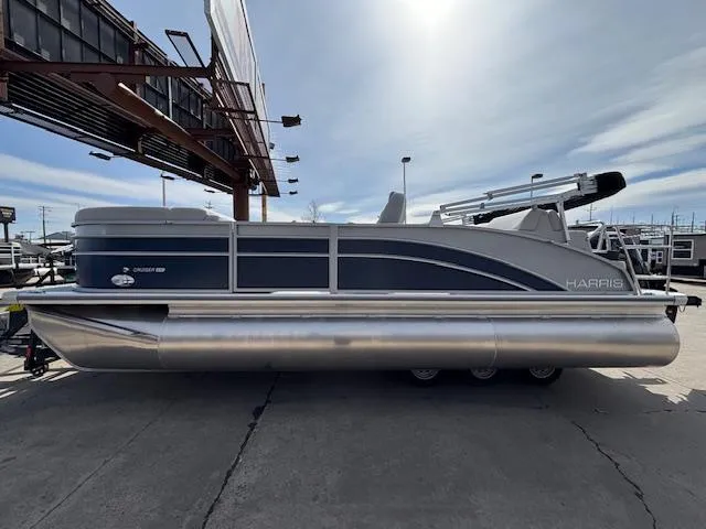 This 2025 Harris Cruiser 210 with the SLDH Floorplan powered by a 115hp Mercury 4 Stroke, is Matte Midnight Blue with the Platinum Silver Accent is optioned with: the 225 Chassis 2-25" Diameter Pontoons with Strakes and Keel, Xtreme Steering, 10' Black Bimini Top, Tech 1 Package, Convenience Package, interior Lighting Package, Lillipad Easy Step Ladder, Skit Tow Bar, Stone Gray Woven Full Flooring, Wireless Mobile Phone Charger/Holder, NSX7 Simrad, Stereo Upgrade JL Head with 6 Clarion Speakers, Docking Lights, Rail Safety Sanctions, Cover and a Table. ( Pontoon is not a Tri Log )