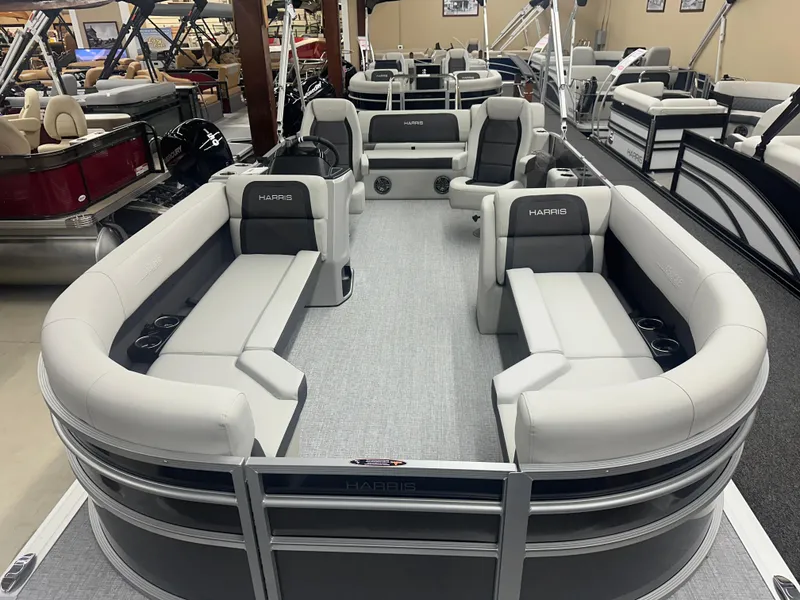This 2025 Harris Cruiser 230 SLDH Tri Toon is powered by a 200hp. (Max Engine HP is 300hp) Options and Features include Fence mounted docking lights, High Back Lux captains and co Captains chairs, JL Audio radio with six 6.5" Speakers, Simrad NSX Screen with Mercury Vessel View monitor for all gauge functions, depth, fish finder and GPS. Midship chaise end lounge flip up table, Pedestal table, Stainless Steel ski tow bar, Stern Saftey rail and chains, 4 Step telescopic 4 step stern ladder, bimini top and a mooring cover.