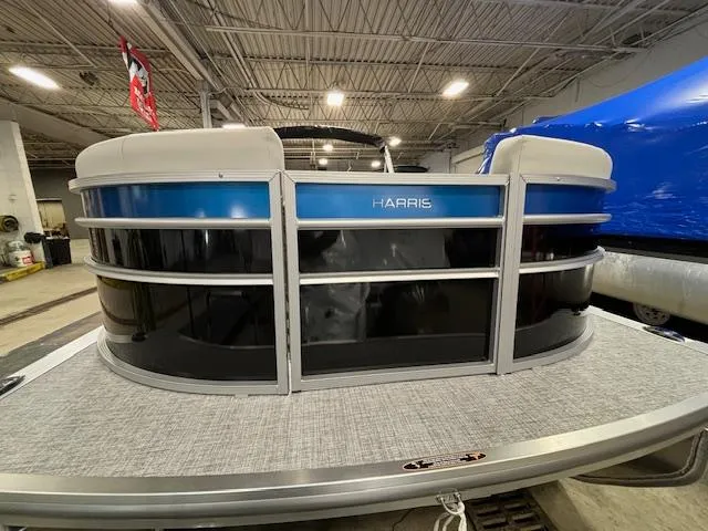 This Harris 230 Cruiser is Ebony Metallic with the vivid blue metallic accent, and comes with a 115HP Mercury 4 stroke engine, depth finder, stereo, docking lights, seagrass flooring, table, rail safety, ski tow bar, convenience package and a cover. ( Pontoon is still in Factory Shrink Wrap, Factory Photos shows Tri -Log, Actual Pontoon is not a Tri-Log)