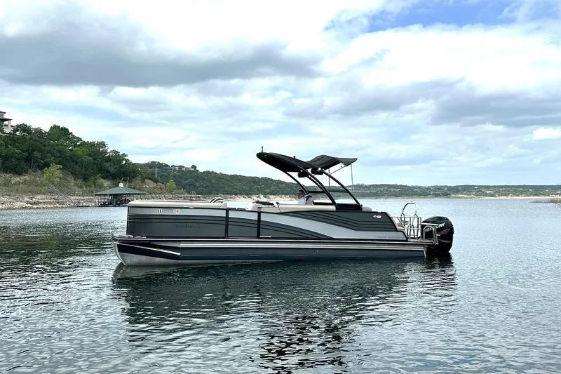2018 Harris Grand Mariner 250 Top-of-the-Line Tritoon. VERY nice condition! Powered by Mercury Verado Four-Stroke 300 Pro. Only 109 hours! Auto trim. Simrad GPS. Well-appointed diamond stitch accent seating including wrap-around lounges and a large convertible sun pad aft. Fold down serving table. Fore and aft walk-through. Large swim platform. Upgraded stainless ladder. Ski tow bar. Collapsible changing area. Tower with speakers and double bimini top. JL Audio stereo, speakers, sub with remote at the transom. Blue LED lighting throughout cockpit and backlit in speakers. Plenty of storage. Exterior, upholstery, seagrass flooring like new! Stored in covered slip. A Must See!