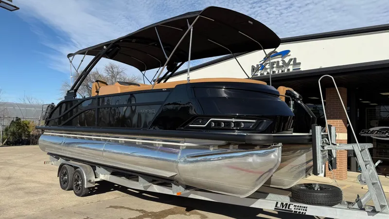 Basically new Harris we just took on consignment here at NXTLVL Marine Dallas 940-279-1397 Options: Simrad NSX9 Delux Tech PKG1 Polished Tubes Manual Tower with Black Bimini Double Bimini Total light package Dual high back help seats Full Flooring Table Upgraded pillowtop vinyl Black out package Ski Tow pylon JL Diamond sound system with the extra subwoofer for premium sounds 3 battery system with switch and onboard charger Includes 2024 Mcclain 25' trailer 4LYBA2527RH002660