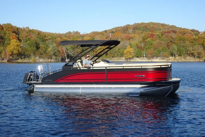 This is a new 2026 Harris Solstice 250 SL Tri-toon in Ruby Red Metallic Fence Color w/ Matte Black Accent and Dune Interior. It is powered by a Mercury 300hp Verado 4-Stroke and has the following options: