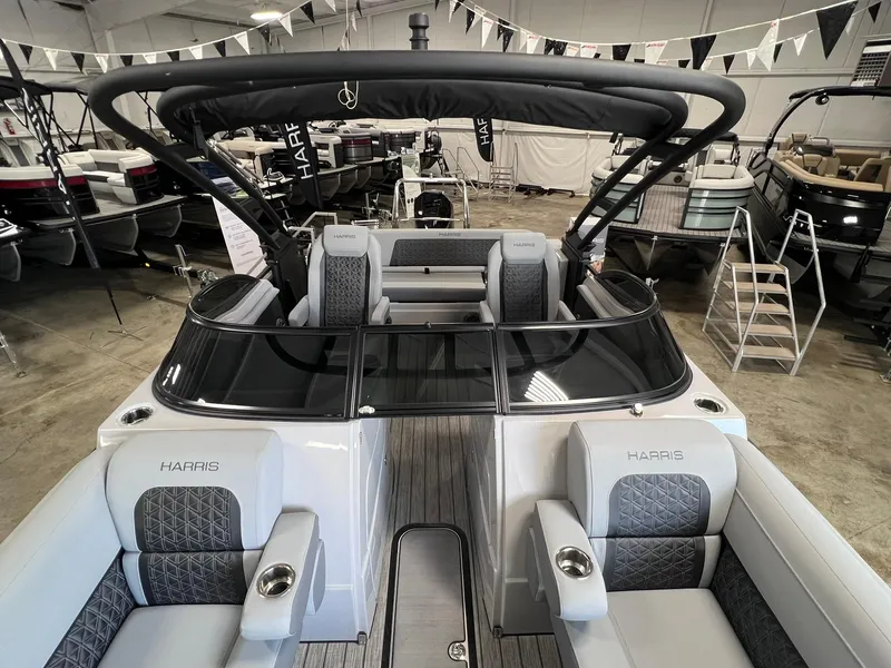 Featuring Harris's Exclusive RPM 325 Tube Chassis, with 2-25"outer toons, center 27" toon, Large Lifting Strakes, Reinforced Nose Cone All .090 Gauge Toons, 50 Gal. Fuel Tank. Very Large In Floor Storage. 4- Flip up Cleats, Docking Lights, Large Fenders with Quick Clip Fasteners, Fastclip Mooring Cover, Ski Bar, Extended Aft Deck, Stainless Steel Swim Ladder, All JL Audio with 10 Speakers, Aft Remote, Interior RGB Lighting, Lighted Cupholders, Speakers and Seat Bases.