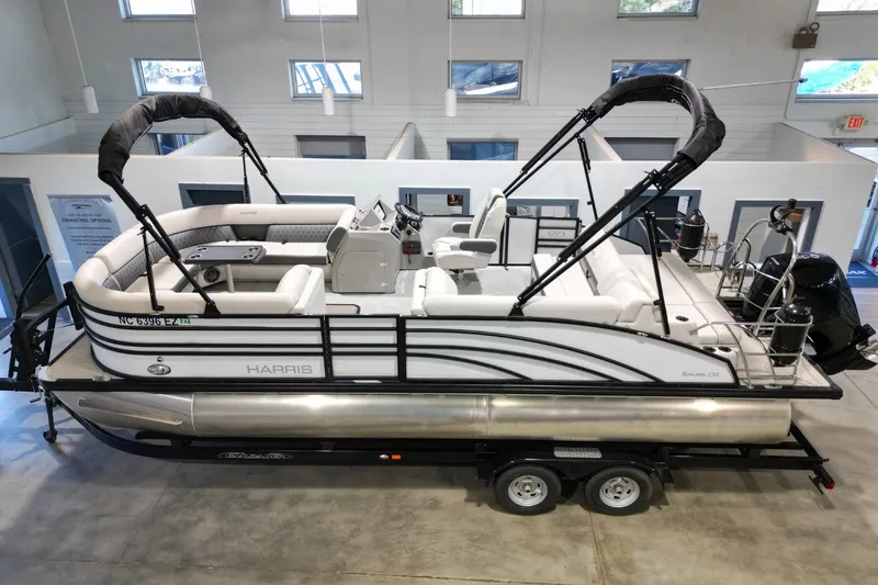 This 2023 Harris Sunliner 230 blends upscale styling, smart technology, and strong V6 performance into a versatile pontoon that's perfect for cruising, entertaining, and watersports. Finished in an elegant White Diamond exterior with Black Edition accents, it delivers a modern, high-end look on the water. The thoughtfully designed layout features a single rear-facing lounger, extended swim platform, and plush Moonlight Gray furniture for all-day comfort.