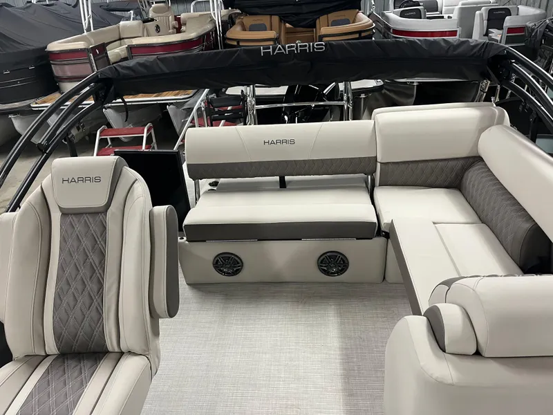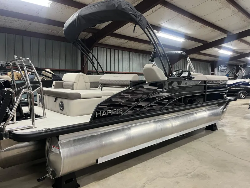 Find the perfect mix of luxury, performance, and value in this 2025 Harris Sunliner 230 Tritoon. This boat is packed with everything you need for your trip on the water. This boat is powered by a 175 Mercury outboard with digital throttle controls. The boat also has a powered bimini top, Simrad flush-mount dash unit, full-length lifting strakes, and the rear swinging lounge seat.