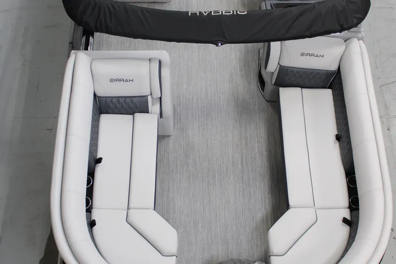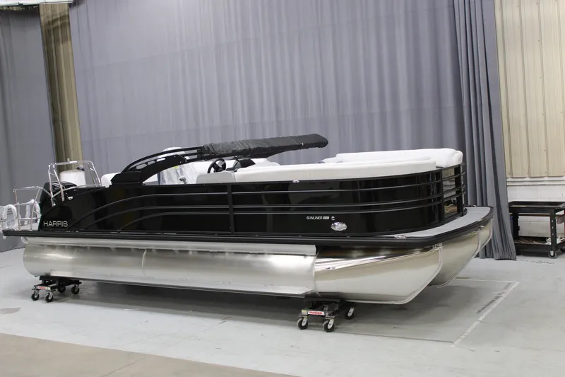 2025 Harris Sunliner 230 with Mercury 200HP, Ebony Metallic, black edition, pillowtop moonlight gray furniture, interior lighting package, ski tow bar, wireless phone charger, seat covers and much more!