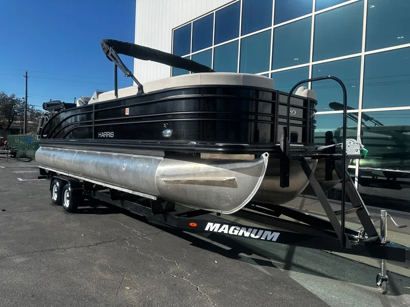 - This lightly used 2022 Harris 250 Sunliner checks all the boxes for what people are looking for in a contemporary, modern tri-toon boat. This Sunliner is powered by a Mercury 225 HP 4 stroke, with only 75 hours. With this motor and the tri-toon configuration, she jumps on plane and would have no problem pulling all kinds of watersports.The interior features Harris' ever popular SL seating, great for lounging and floating at anchor in your favorite cove. The rear lounge folds down and converts to a 2 person sunbed for the ultimate in relaxation and comfort. You can set up a double bimini top that will practically shade the entire boat. This 25' tri-toon is and awesome social and family platform to deal in you friends and family when you are headed to the lake. The instrumentation features a 9" SIMRAD multi function screen that displays GPS, depth/fish finder, and the Mercury instruments. The boat has a JL Audio Media Master stereo with 6 cockpit speakers, subwoofer and amp. The Sunliner has been recently annually serviced and is ready to go for the upcoming season. This boat comes with a Magnum Tandem Tri-toon Trailer with new tires.