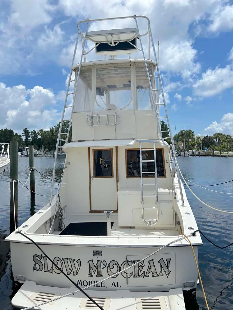 Slow M'Ocean provides for a 360 degree view on the bridge as well as the tower, has a full serve galley and roomy salon. Use as a fisher, trawler (8 knot Idle) or family cruiser (Master and Guest staterooms). She features an interior with mahogany woodwork, wall-to-wall carpet and high quality hardware/fixtures. The cockpit is quite large! Fully air conditioned/heated and the head includes an electric toilet, stand-up shower, sink, vanity, macerator and holding tank.