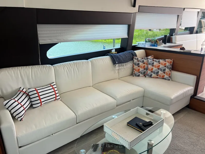 A three-panel glass door framed in stainless steel slides opens to allow entrance to the 60's airy salon (the panels stack to port and create an extra large, patio-like portal to the aft deck). The salon itself features a large sofa opposite a smaller settee - perfect for casual conversation. A 36-inch flat-screen TV is mounted under the galley countertop, and oversized frameless windows provide an unobstructed, panoramic view of the horizon all around.