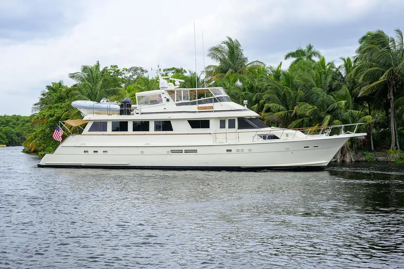 For years, Hatteras Yachts had produced some of the great and classic motor yachts of all time. "Forever Young" is a very unique 1991 78' Cockpit Motoryacht with one of the few Euro style transoms with steps going up each side and a nice large stand up lazarette in the cockpit. The current owners of this Cockpit Motoryacht have owned it and lived aboard for 22 years, assuring all of its maintenance and systems are always functioning. Her classic layout features five staterooms including one being used for storage, a nice full beam salon, a full galley, dinette, aft deck with a table that will seat 8. "Forever Young" features a huge bridge with plenty of seating, wet bar with seating and a BBQ grill. The AC systems have been updated, as well as the davit and enclosure on the bridge. She includes a 2010 Nautica LTD w/ a 115hp Yamaha engine. Other key features are the Naiad stabilizers, new Starlink, new custom bow lounge seating with fold down bimini top, new cushions in 2024,1600 gpd Sea Recovery water maker, and upgraded wood flooring throughout. The 1991 78 Hatteras Cockpit Motoryacht makes a great yacht for cruising and is still a great liveaboard. Located in Fort Lauderdale and easy to see. Make an appointment today to see "Forever Young".
