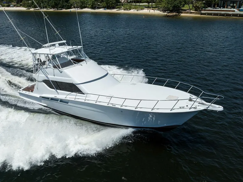 The aerodynamic, seamless look of the Hatteras 60 Convertible contributes to her overall quality, as she tracks sharply through calm and big rollers alike. This three-stateroom sportfisherman features an elegant salon and dinette area designed for comfort and convenience. Standard features include fluted wood valances with blinds, an under-counter refrigerator / freezer unit, a four-burner cook top, and a microwave / convection oven. Below, two of the three staterooms feature queen berths with storage and private heads. For those with larger families, a four-stateroom, three-head arrangement is also available. The 151-square-foot cockpit is primed for fishing with a bait and tackle center, a drop-in bait freezer, rod holders, seawater and freshwater washdowns, a flush in-deck storage box with macerator pump, and a refrigerated compartment that doubles as a livewell. The flybridge offers a standard open arrangement with a top-loading drink box, rod storage in the forward locker, and a port seat, as well as a standard electronics package. An optional enclosed bridge is available, as is an optional stairwell from the salon to the action up top.