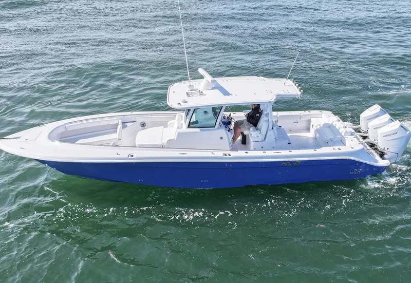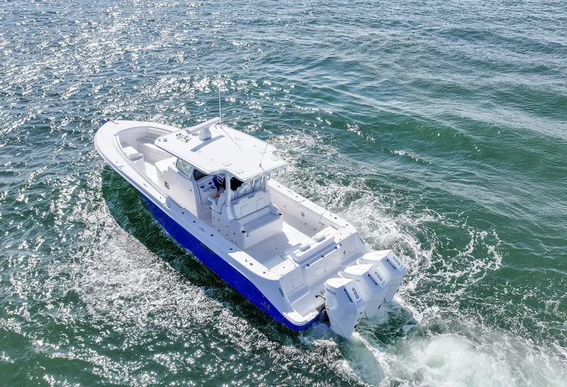 This family-friendly center console yacht is a comparison shoppers dream, with the all of the desired standard features and comfort you expect from HCB. Stepping aboard you will immediately notice the spacious aft layout and rear facing lounge seat that easily converts to a tackle station by simply folding down the seat back. The unintimidating helm, like all of the Speciale's big sisters, boasts a terrific panoramic view with the cross-curved, non-glaring glass, clean automotive-inspired helm station, 3 of the largest displays in its class, and three comfortable helm seats.