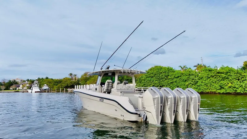 This incredible vessel is powered by *quad Mercury 400V10 engines*, ensuring blistering speed and smooth cruising even in the toughest conditions. Equipped with the *Seakeeper stabilizer*, your ride will be incredibly stable, offering a smooth, vibration-free experience, even at high speeds.