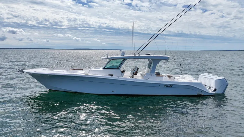 This boat is truly loaded. She sports quad v12 600HP Mercs, Starlink, JL Audio, Gemlux 22' outriggers, teak throughout and so much more. She is sitting in the water and ready for immediate sea trial.