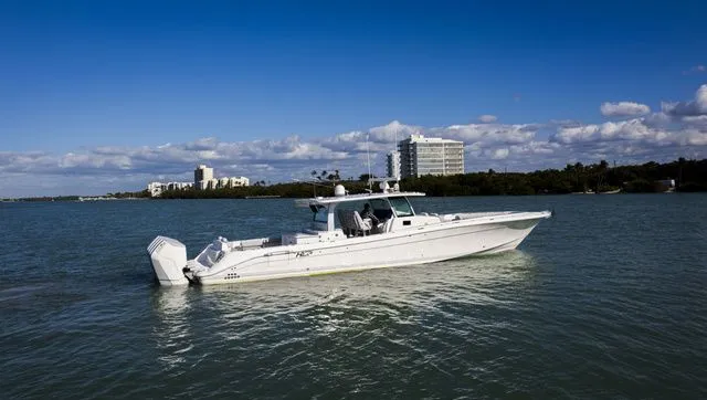 Finally, a large center console yacht with the sophisticated design to perfectly balance speed, ride, comfort, and all of the luxury of your "dream" yacht. The bow area is dual purpose with seating to accommodate guests on the forward-facing lounger or around bow seats and table that convert to a large sun pad for lazy days catching rays; or remove the cushions for a fully functional fishing platform. The luxuriously functional cabin with queen sized berth, storage galore, galley kitchen, and separate head/shower compartment is the perfect place for air-conditioned comfort on hot days as well as longer trips with overnight stays.