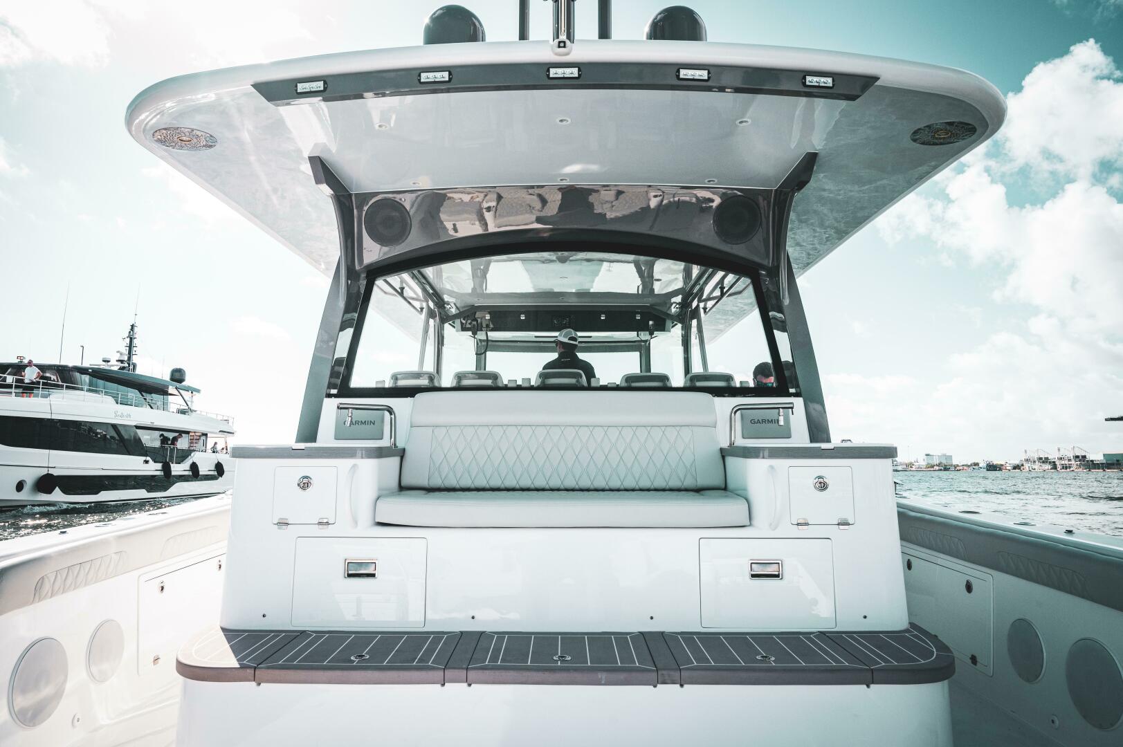 Seating - Transom Cooler Seats, 28 Qt, Port and Starboard with Cushions and Backrests Seating - Helm Chairs for 5 with Swivel and Vertical Adjustment; Fold Down Footrests and Custom Ladder Backs