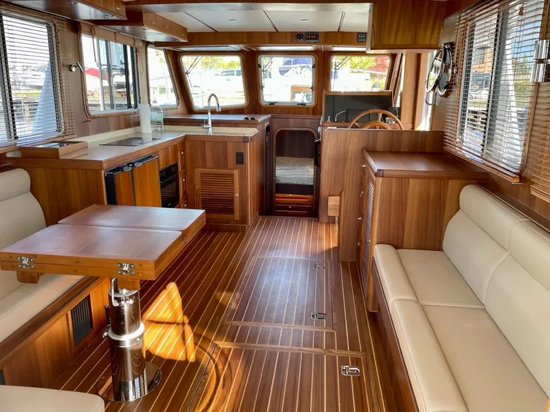 Entering the cabin from the cockpit there is a custom-specified interior layout reminiscent of the Grand Banks Europa trawlers. To port is a L-shaped dining settee with a high / low table which converts to a double berth. To starboard is a linear settee, the same length as the dining settee, which also serves as a single berth.