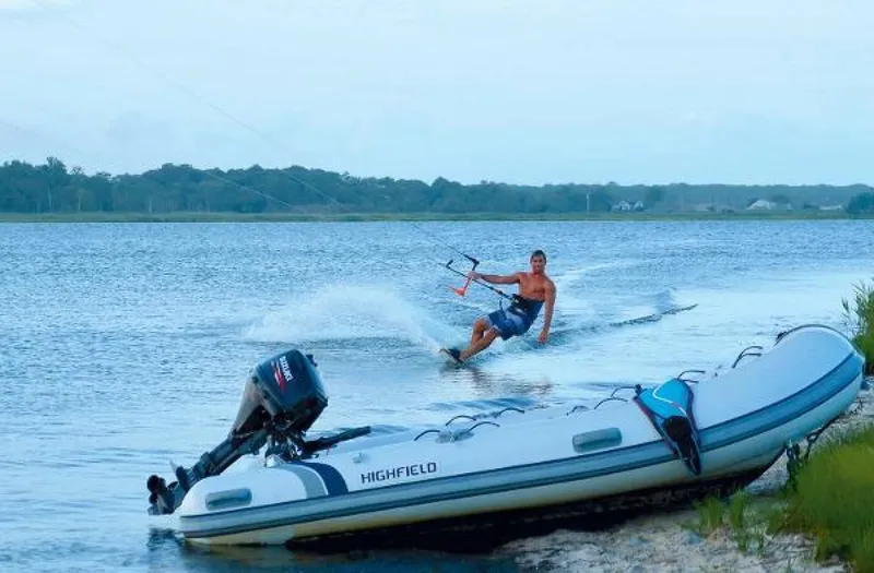 Standard features include Orca Hypalon or Valmex PVC tubes (Hypalon included in price listed), flush mount non-return vavles, a self draining deck, a bow locker to fit a six gallon fuel tank, a tank strap kit, integrated transom supports, a removable seat and an under-seat bag, lifting points and towing eyes, tow bridle points, a brushed foam teak deck, a full length keel guard, a heavy duty rub rail, a Highfield dry bag, a foot pump, oars, and a repair kit. Optional features are available as upgrades and include an extra seat, a transom storage box, a bow cushion, a molded bow cleat, a boat cover, or an FCT console.