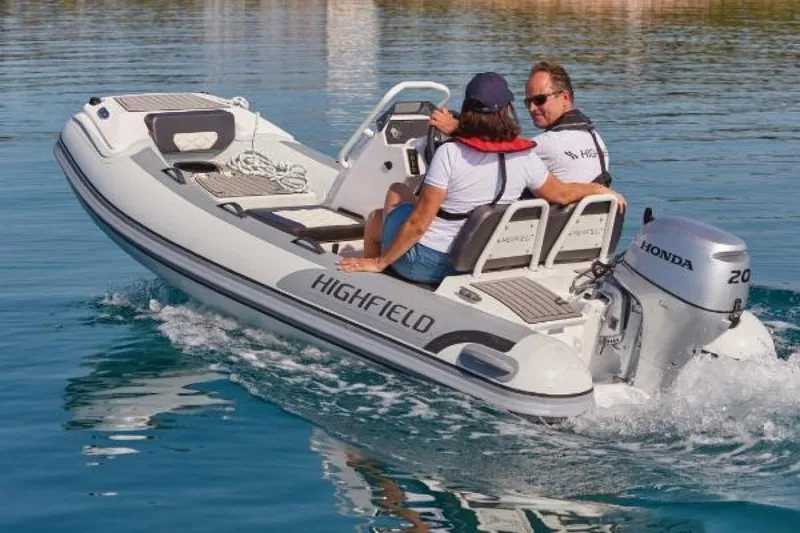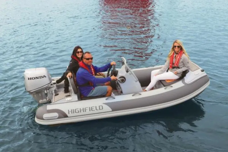 The Highfield Classic 340 Deluxe is a high-end inflatable tender with a durable powder coated aluminum hull. Its wide interior space, self draining deck, and storage space attribute to its high level of comfort. Standard features include a high tensile chromated and powder coated aluminum hull, an integrated aft seat and cushion, a low profile console, integrated transom supports, a bow locker to fit a six gallon fuel tank, a tank strap kit, lifting points and towing eyes, tow bridle points, a brushed foam teak finish deck, a heavy duty rub rail, a full length keel guard, an under-seat bag, an electrical pack for the boat and console, and a foot pump, oars, and a repair kit. A boat cover is available as an option.