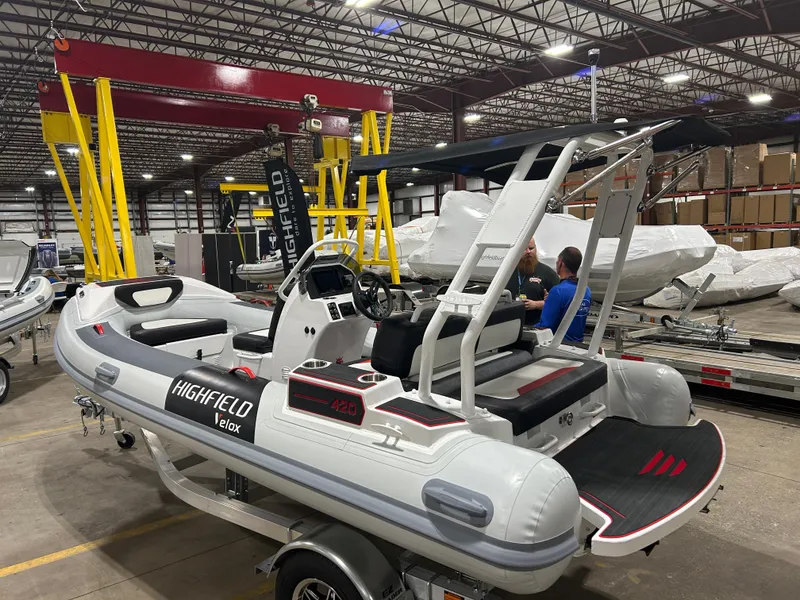 This 2025 model in Light Grey Hypalon tubes with red accents will be available for pickup or delivery starting in January, following the Chicago Boat Show. Priced here with an aluminum EZ Load'r trailer, but base boat or boat with galvanized steel trailer options also available.