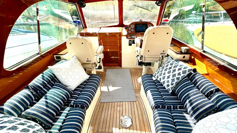 - Hinckley teak package with gloss varnished teak on pilothouse instrument pod, side panels, dash, pilothouse sides, and window frames