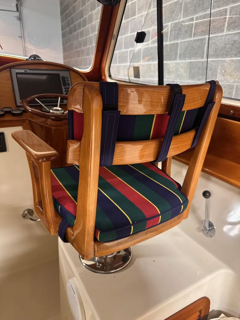 EAGLET is one of the last Hinckley Picnic Boat classics built, she is hull 191. Here green hull and cream deck give her the classic downeast look. She has a 420 Yanmar which has 590 hours on her. Recent cushions and an additional Raymarine chart plotter on the port side Nav Seat. Custom helm and navigator seating made by The Hinckley Company when she was built for her original owner.