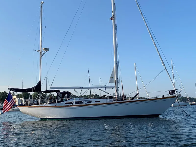 BACCARA is a 50' Hinckley Sou'wester Yawl built in 1977 to the highest standards. This broker helped her current owners purchase her in Seattle in December 2009. After a season cruising in the Pacific Northwest, she was trucked to New England where she has sailed seasonally ever since while wintering in heated inside storage. BACCARA's condition in all aspects belies her age due to the high quality of her original construction and the exceptional care she has enjoyed since she was new, in particular with these owners. Her topsides were stripped, faired, and Awlgripped by Hodgdon Yachts in 2014. Between 2019 to 2021, all the hardware on the waterways, trunk cabin, and cockpit was removed for Awlgrip and then re-bedded.