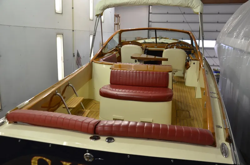• Cream Gelcoat with gloss- varnish teak trim and face with engine gauges and controls