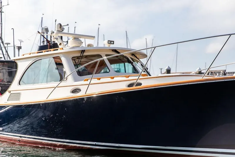- Custom shortened and lay back Hinckley-styled mast on pilothouse top-painted to match deck